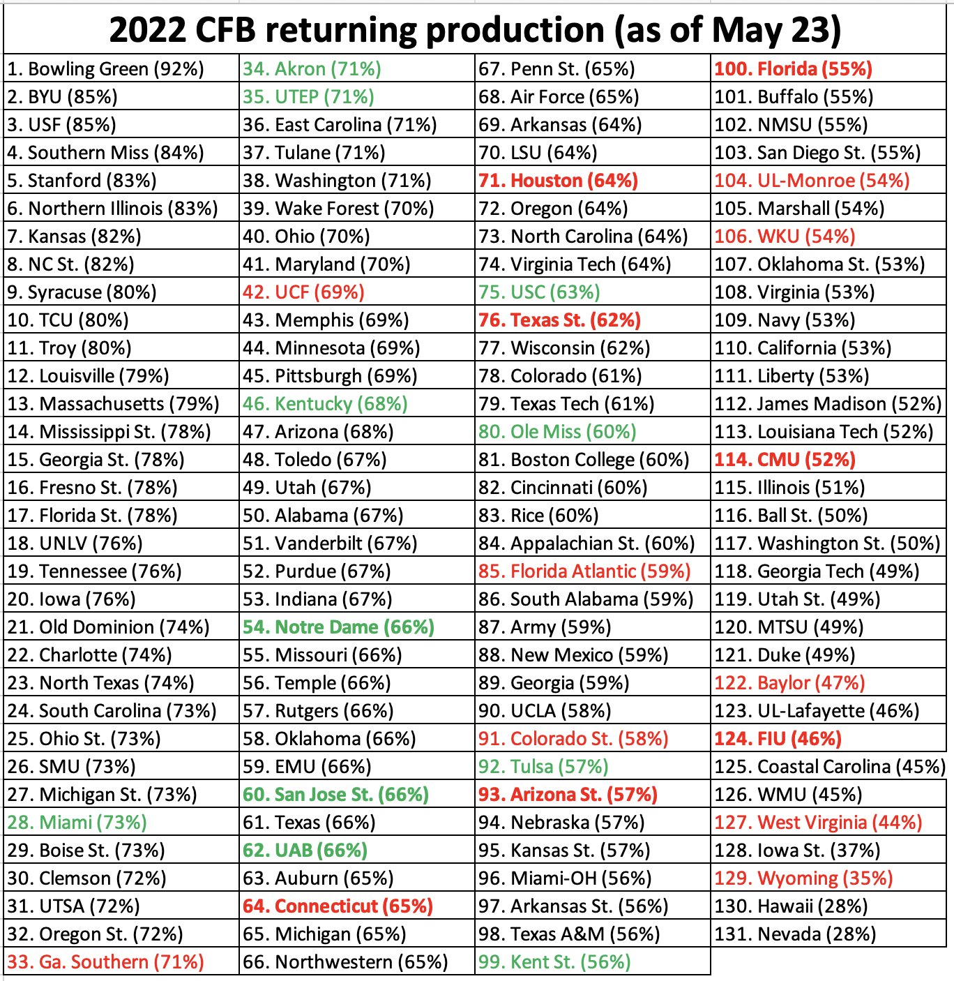 Bill Connelly On Twitter Updated College Football Returning Production Rankings Teams In Green Have Risen By 15 Spots Since Feb Teams In Red Have Fallen By 15 Teams In Bold Have Done